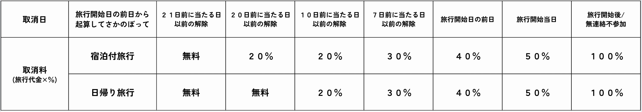 出発日前日から起算し、日帰り旅行は出発日の10日前より/宿泊付旅行は20日前より取消料が発生します。